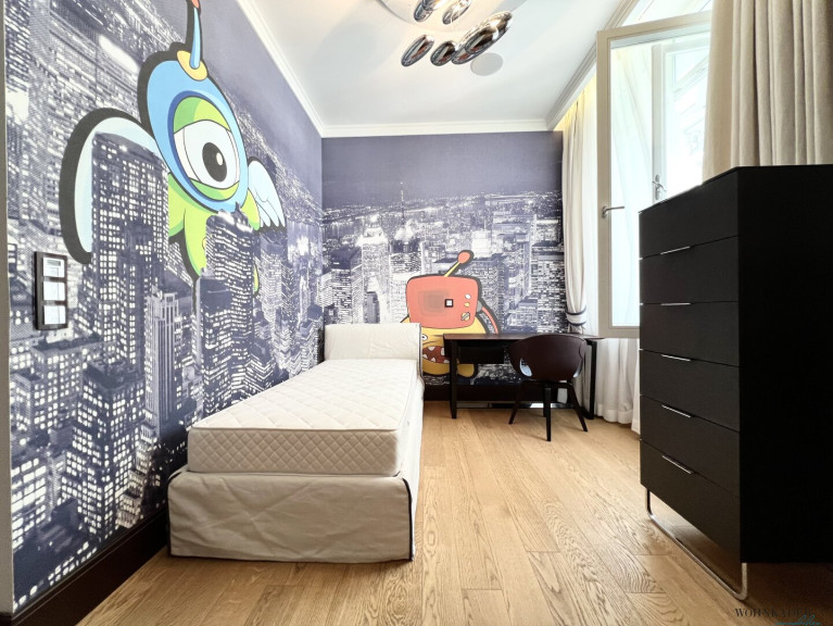 Additionally, there are two more bedrooms, one styled as a girl's princess room and the other in a youthful and modern design. The furniture in these rooms has been carefully selected.