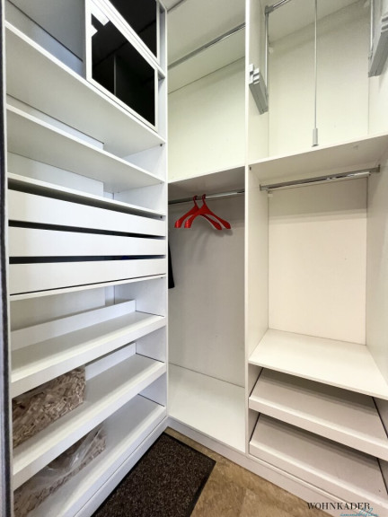 Das Hauptschlafzimmer ist ein Eckzimmer mit großen Fenstern, die sowohl reichlich Tageslicht hereinlassen als auch elektrisch bedienbare Vorhänge bieten. Das Zimmer verfügt über eine begehbare Garderobe, die Ihren Komfort gewährleistet.