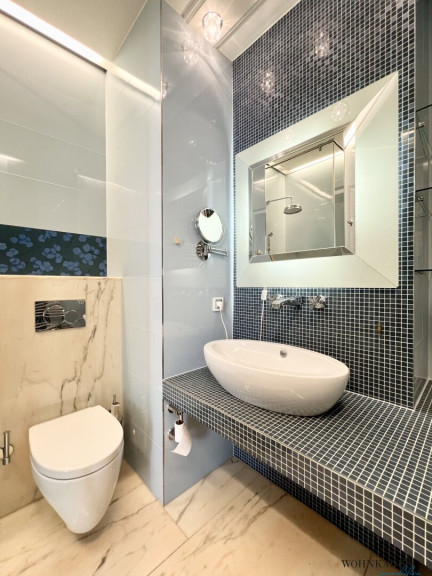 Die Wohnung: Diese Wohnung wurde elegant, extravagant und mit höchster Qualität eingerichtet. Das Wohnzimmer besticht durch den Einsatz von echtem Stein, darunter Onyx und Marmor, sowie einen Marmorkamin, der alle Blicke auf sich zieht. Der gesamte Wohnbereich wird von prächtigen Murano-Leuchten erhellt. Die Küche ist mit Marmor und hochwertigen Geräten ausgestattet. Über dem Marmortisch hängt eine riesige Murano-Leuchte, die den gesamten Bereich schmückt.