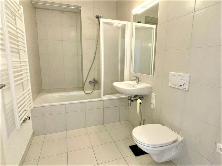 + Badezimmer mit Badewanne, Waschtisch, WC und Waschmaschinenanschluss