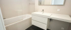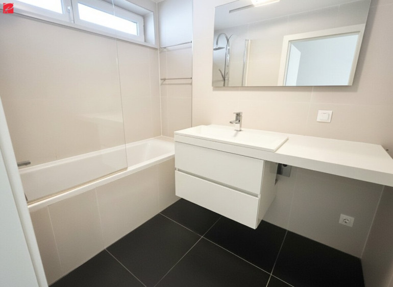 Das modern gestaltete Badezimmer verfügt über eine Badewanne – perfekt zum Entspannen nach einem langen Tag. Zusätzlich gibt es ein separates WC mit Waschbecken, ebenfalls zeitgemäß ausgeführt. Die gesamte Wohnung ist einheitlich mit pflegeleichten Fliesen ausgestattet, was ein modernes und zugleich praktisches Wohngefühl schafft.