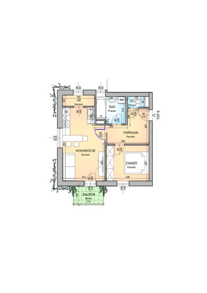 Raumaufteilung: Vorraum mit Glaswand zur Wohnküche, Schlafzimmer, Tageslichtbad mit Badewanne, separate Toilette, Abstellraum, Balkon
