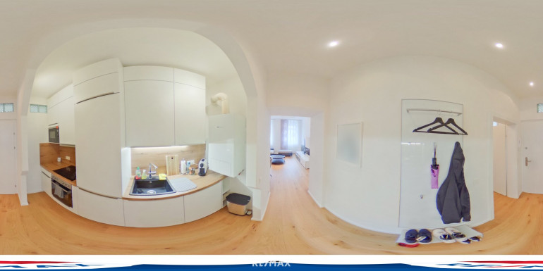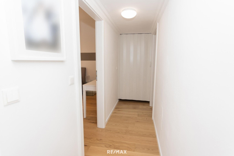Über den Vorraum gelangen Sie linkerhand in den Küchenbereich, rechterhand in ein Zimmer und geradeaus in das Wohnzimmer.