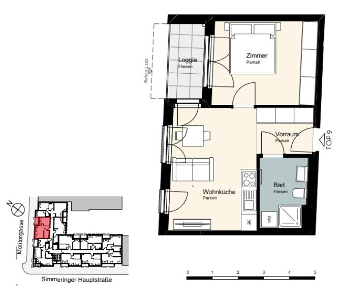 Vorraum / Wohnküche inklusive Einbauküche / Schlafzimmer / Badezimmer inklusive Dusche, WC und Waschmaschinenanschluss / Loggia