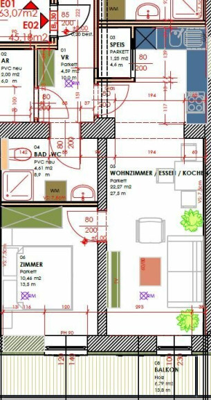 Die Immobilie befindet sich im EG eines fünfstöckigen Gebäudes und hat ca. 45,18 m². Sie betreten die Wohnung durch einen Vorraum. Auf der rechten Seite, am Ende des Vorraumes, finden Sie das Badezimmer, welches über eine Dusche, eine Toilette und einen Waschmaschinenanschluss verfügt, den Abstellraum und den Zugang zu der Wohnküche. Letzteres stellt das Herz der charmanten Wohnung dar und ist ca. 22,27 m² groß. Unmittelbar neben der Küche befindet sich ein kleiner aber praktischer Raum, welcher als Speisekammer genützt werden kann. Über das Wohnzimmer erreichen Sie das ca. 10,46 m² große Schlafzimmer der gemütlichen Wohnung. Sowohl vom Wohnzimmer, als auch vom Schlafzimmer führt ein Zugang auf den ca. 6,79 m² großen Balkon.