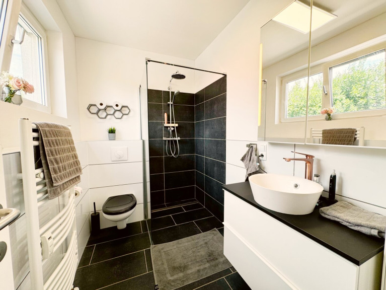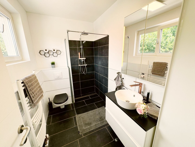 Bad/WC: modernes Badezimmer mit Dusche & WC, separates WC möglich (derzeit Waschraum)
