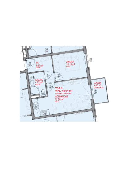 Raumaufteilung: Vorraum, Wohnküche, Loggia, Schlafzimmer, Duschbad mit Toilette