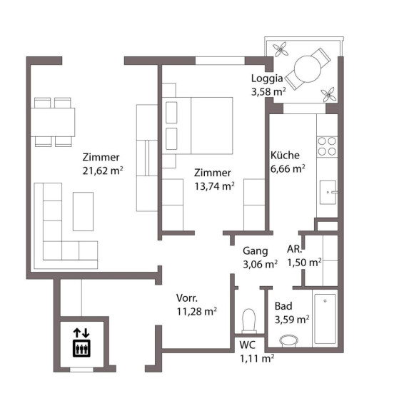 Eine separate Küche mit Fenster zur verbauten Loggia unterstreicht den Wohnraumkomfort. Vom rund 21m² großem Wohnraum, der mit einem bodentiefen französischem Fenster ausgestattet ist, haben Sie einen beeindruckenden Fernblick über die Umgebung. Die kleine Loggia ist vom Schlafraum zu begehen. Hier können Sie ihr morgendliches Frühstück genießen und ihre Blicke über die Umgebung schweifen lassen.