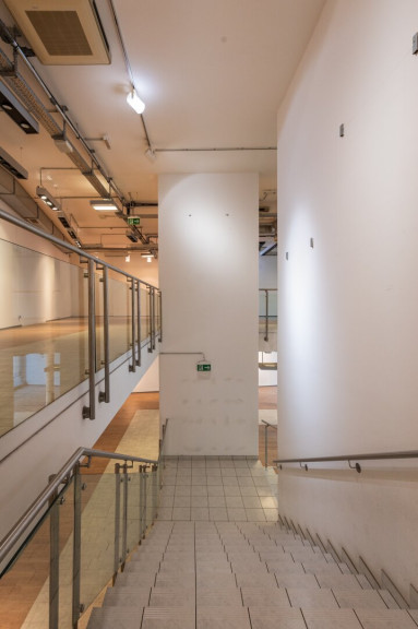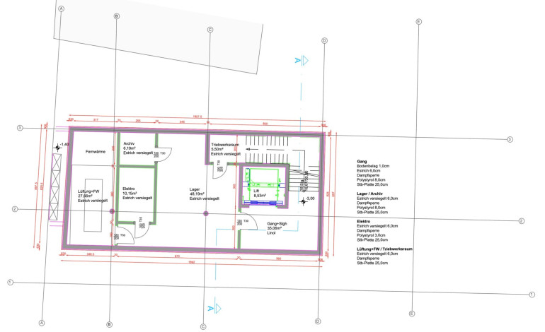 Getrennte Sanitärbereiche für Kunden und Mitarbeiter sowie ein Aufenthaltsraum sind im 1. Obergeschoss untergebracht. Ein Kabinenlift für den barrierefreien Zugang in alle Geschosse ist vorhanden.