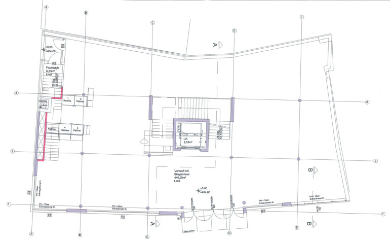 Verkaufsfläche im Erdgeschoß 446,28m² und im 1. Obergeschoss Verkauf inkl. Stiegenhaus 421,84m² sowie 48m² Lagerfläche im Kellergeschoss.