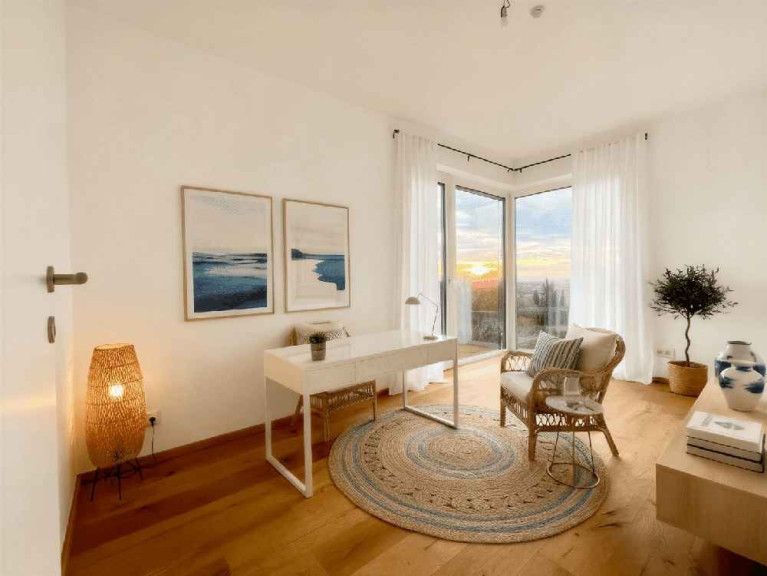 Über die inneliegende Stiege erreichen Sie drei Schlafzimmer sowie zwei großzügige Badezimmer. Vom Master-Bedroom können Sie den Balkon sowie einen schönen Weitblick genießen. Ein Zimmer bietet ein Eckfenster mit einem atemberaubenden, unverbaubaren Fernblick.