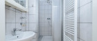 - Zeitgemäßes Badezimmer mit Dusche, Waschbecken, Spiegelschrank und Handtuchwärmer