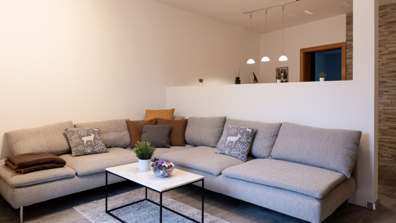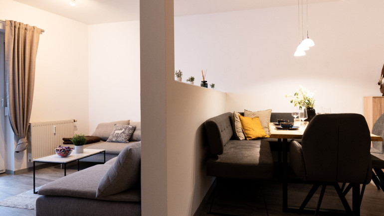 - Offenes Wohnzimmer samt Couch und Esszimmer samt neuer Essgarnitur