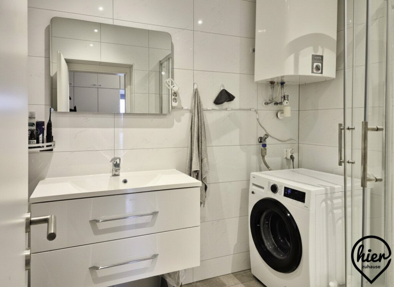 Zentral liegender Vorraum mit Einbauschrank, Abstellraum, WC separat, Bad mit Dusche, Schlafzimmer, Essküche mit Loggia, Wohnzimmer.