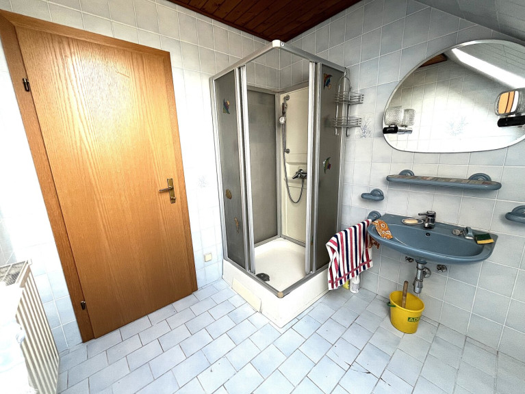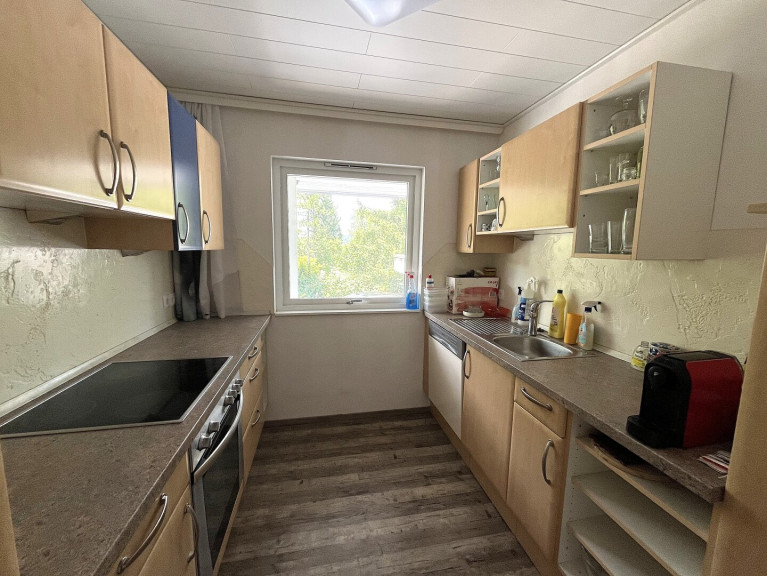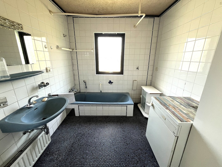 Parkett, Fliesen, Teppichboden, Fußbodenheizung, Heizofen, Zentralheizung, Einbauküche, Bad mit Fenster, Badewanne, Dusche, Parkplatz, Garage