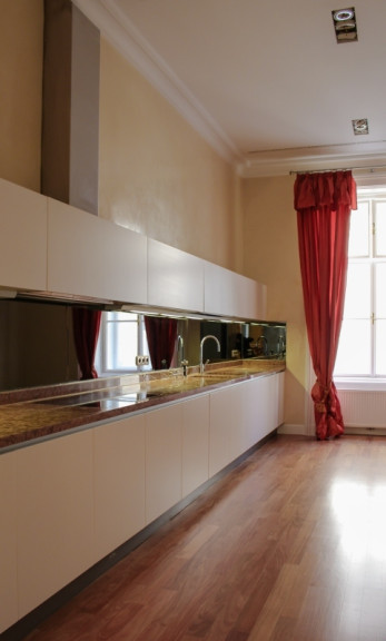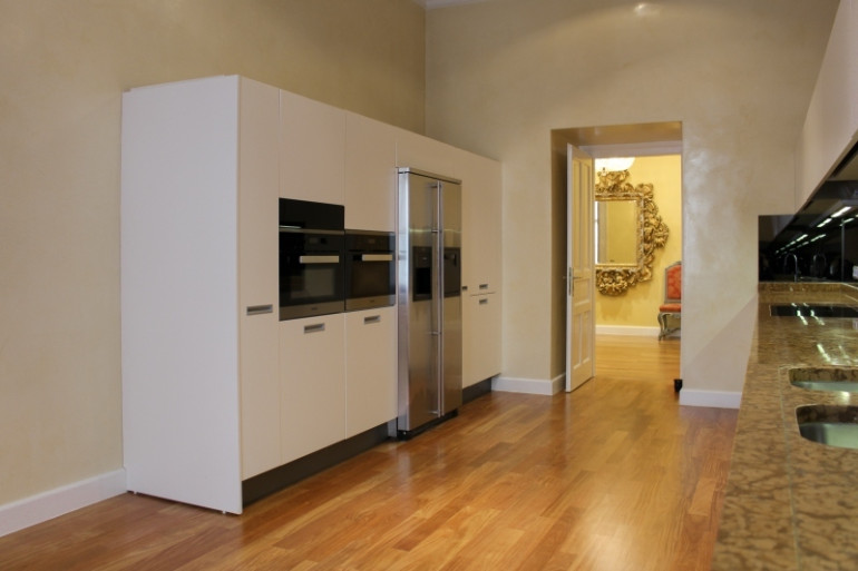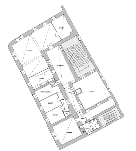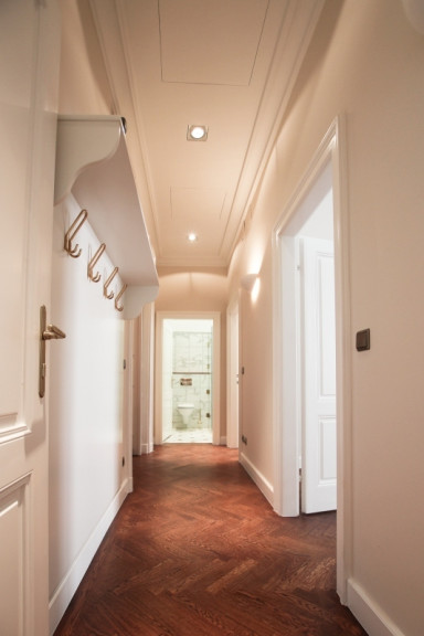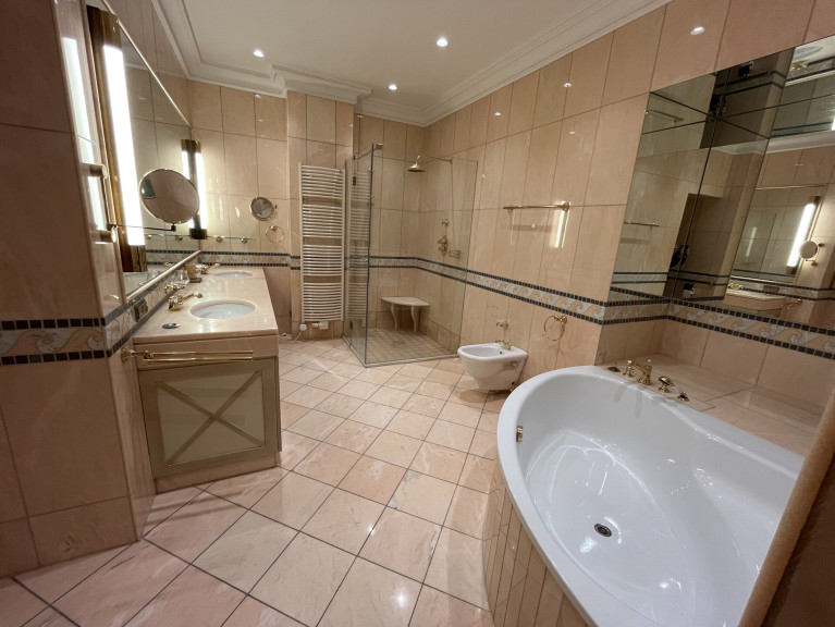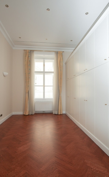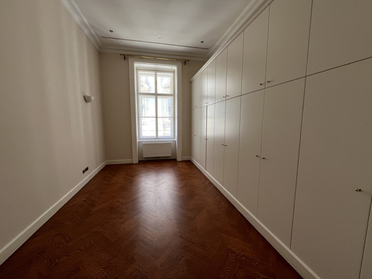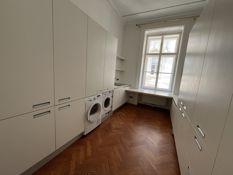 großzügiges Entrée mit Gästetoilette mit Handwaschbecken, beeindruckend großer Wohnsalon (Eckzimmer) mit Blick über die Bankgasse, Bibliothek oder Schlafzimmer, separate Küche - eigener Bereich mit: zwei Schlafzimmer, Wirtschaftsraum mit Einbauschränken, Badezimmer mit Dusche, Waschtisch und WC - großes Schlafzimmer, (Haupt-)Badezimmer mit Eckbadewanne, Dusche, Doppelwaschtisch, Bidet und Toilette, Schrankraum mit Einbauschrank.