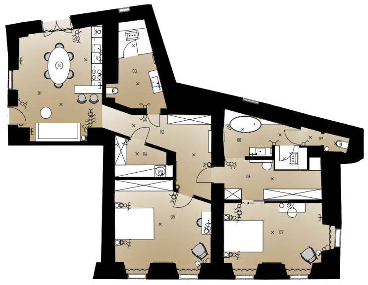 Zentralheizung, Einbauküche, Personenaufzug, Ostbalkon, Südbalkon, Badewanne, Dusche