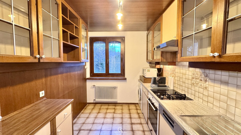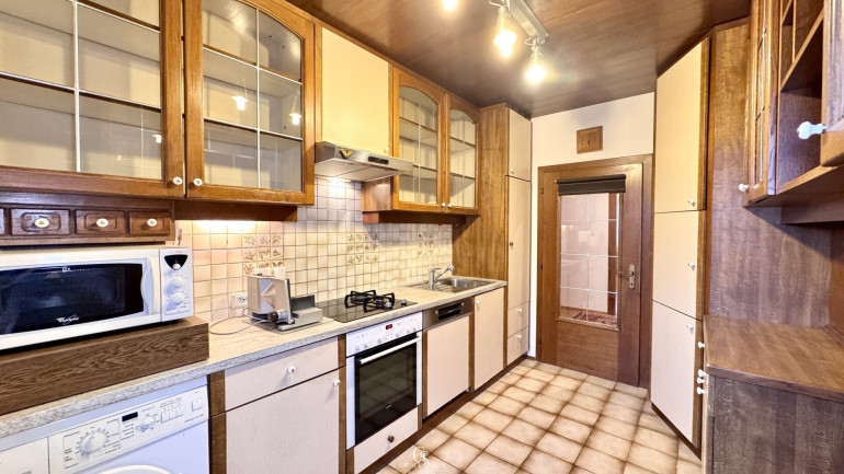 Die Küche befindet sich in einem eigenen, abgeschlossenen Raum und ist mit allen wichtigen Geräten ausgestattet. Auch ein Waschmaschinenanschluss sowie Einbauschränke sind vorhanden – ideal, wenn man den Platz gut nutzen möchte. Das Badezimmer ist, wie die gesamte Wohnung, gepflegt und verfügt über eine Badewanne. Die Toilette ist separat gehalten.