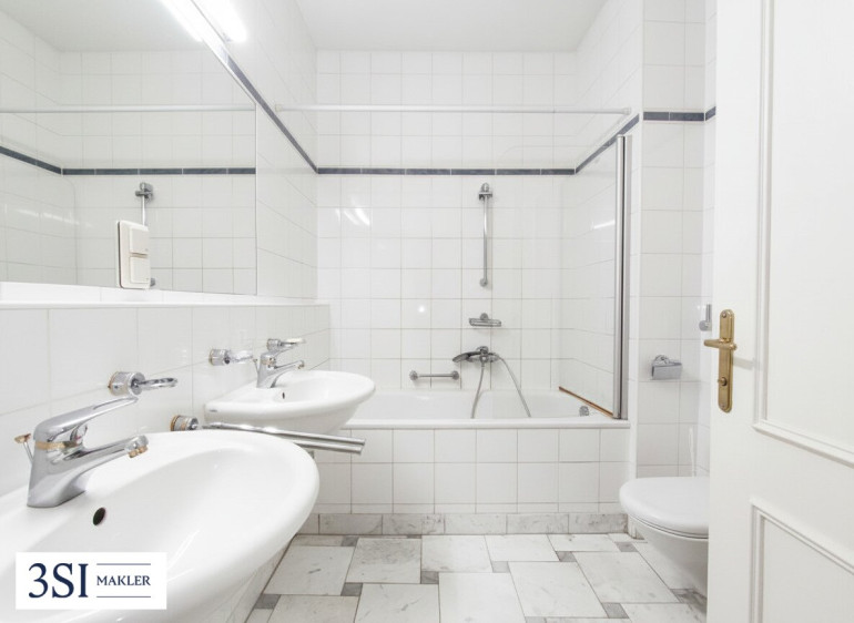 Das Badezimmer mit Badewanne verfügt über zwei Waschbecken und ein WC. Diese außergewöhnliche Wohnung bietet Ihnen nicht nur ein stilvolles Zuhause, sondern auch eine erstklassige Lage im Herzen Wiens. Perfekt für Familien oder Paare, die Wert auf großzügiges Wohnen und ein urbanes Umfeld legen. Eine Fußbodenheizung sorgt für wohltuende Wärme und behagliches Raumklima. Zudem stehen ein Fahrradraum und ein Kellerabteil zur Verfügung.