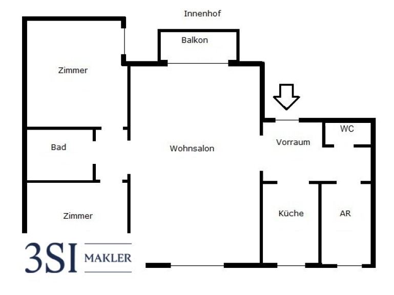 Beim Betreten der Wohnung empfängt Sie ein großzügiger Vorraum, der Zugang zur Küche und zu einem Gäste-WC bietet. Der offene Wohn-Essbereich mit dem hofseitigen Balkon bietet vielfältige Gestaltungsmöglichkeiten. Die separate Küche ist vollständig ausgestattet und verfügt über einen praktischen Abstellraum. Über den Wohnsalon gelangen Sie in den privaten Bereich der Wohnung. Hier erwarten Sie zwei geräumige Schlafzimmer, die ausreichend Platz für Erholung bieten