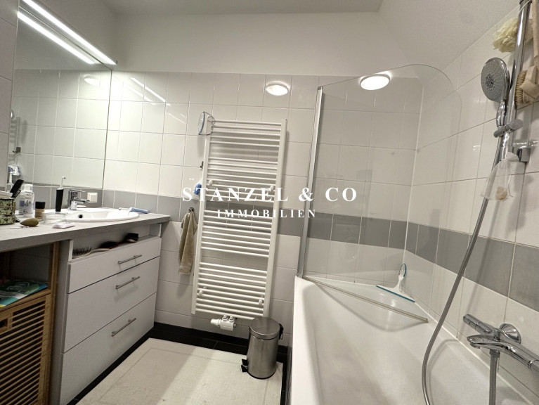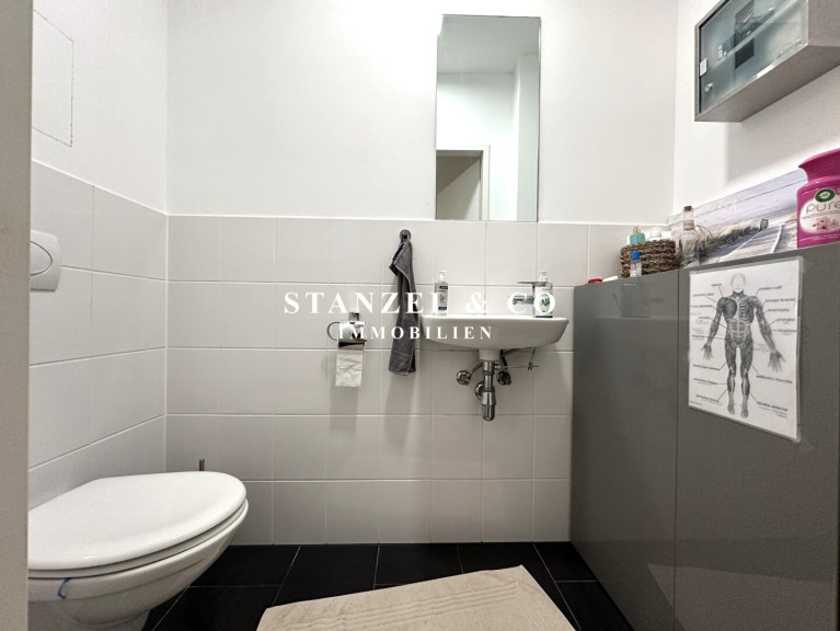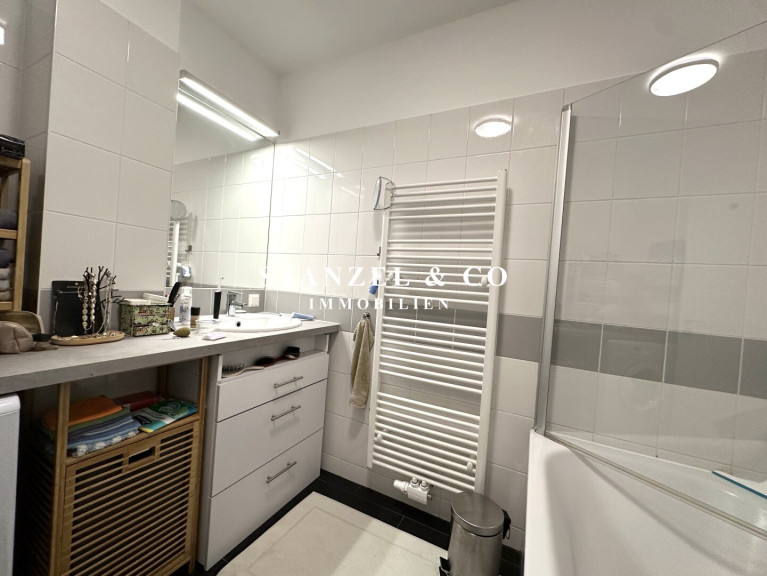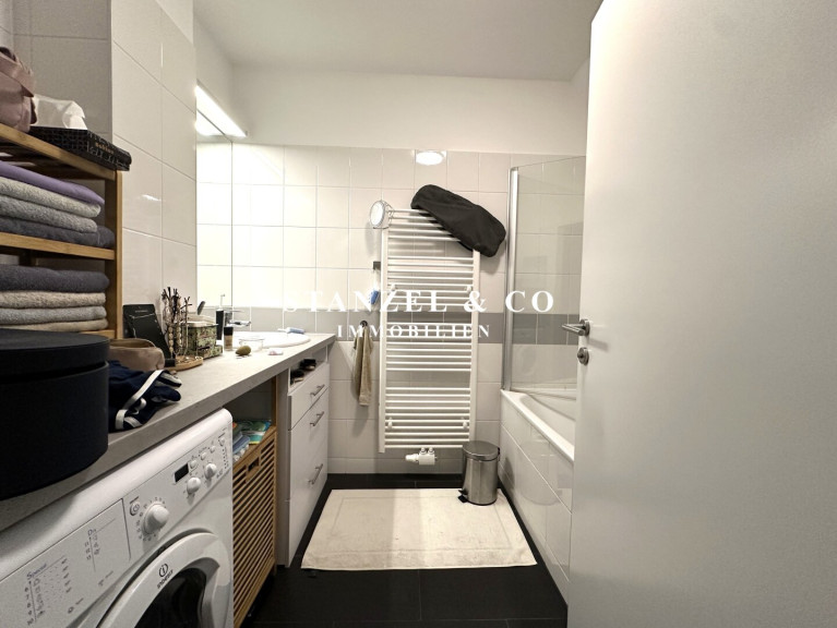 Das Badezimmer ist mit einer Wanne, Waschtisch + fliesenbündigem Spiegel, Handtuchtrockner sowie einer elektrischen Entlüftung ausgestattet ist. Das WC mit Handwaschbecken, Spiegel und elektrischer Entlüftung ist separat. Weiters gibt es einen 2m² großen Abstellraum mit Waschmaschinenanschluss.