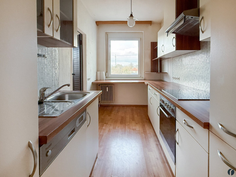 Fliesen, Laminatboden, Zentralheizung, Einbauküche, Personenaufzug, Südbalkon, Dusche, Parkplatz