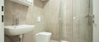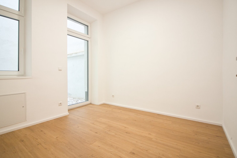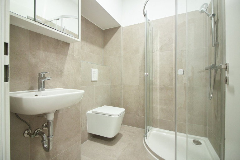 Die Wohnung wird über einen Vorraum betreten, der ausreichend Platz zum Ankommen sowie für eine Garderobe bietet. Rechter Hand befindet sich das Badezimmer mit Waschbecken, Dusche und WC. Linker Hand liegt das gut geschnittene Schlafzimmer mit direktem Ausgang auf eine der beiden zur Wohnung gehörigen Terrassen mit ca. 10 m².