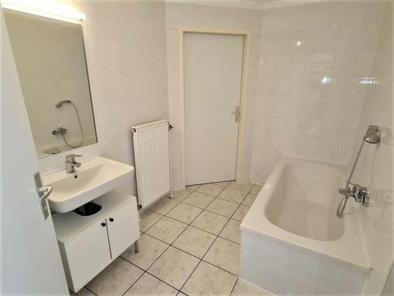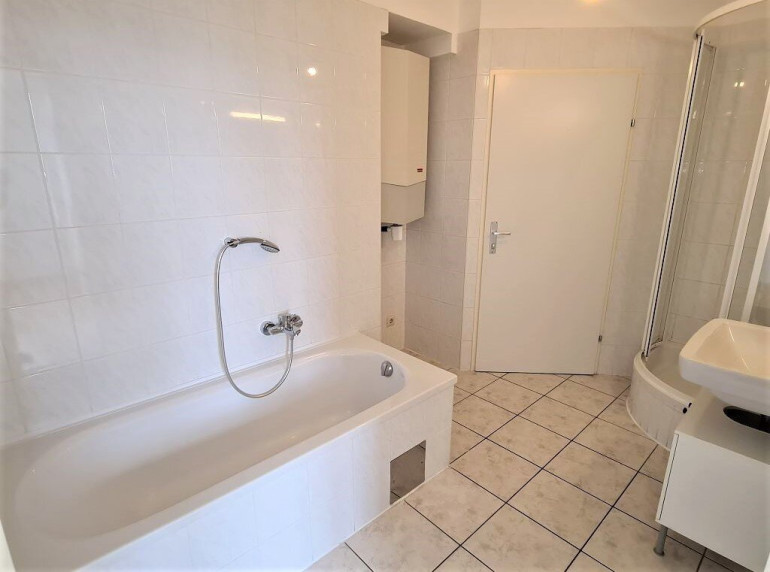 + Badezimmer mit Badewanne, Dusche, Waschtisch und Waschmaschinenanschluss
