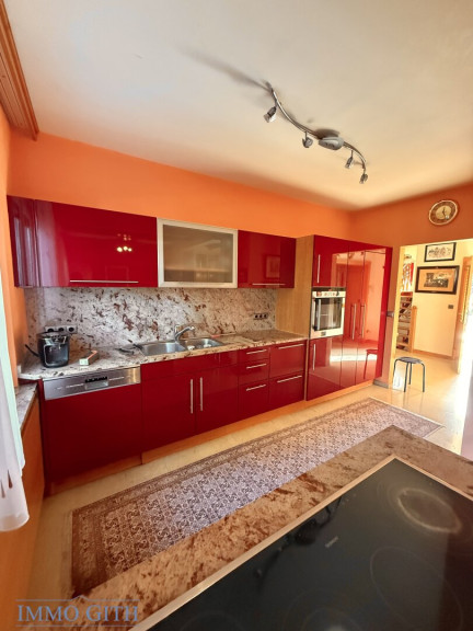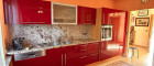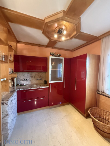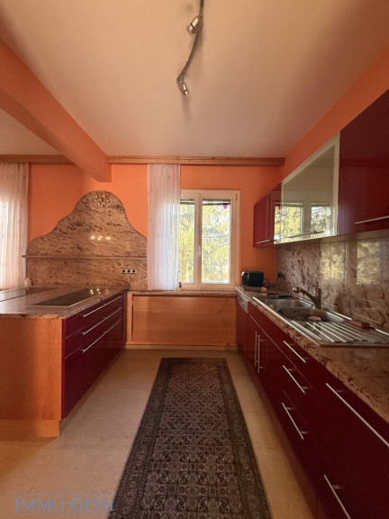 Die Küche präsentiert sich mit großzügigen Arbeitsflächen aus rotem indischem Granit und bietet viel Platz für Kochen, Genuss und geselliges Beisammensein.