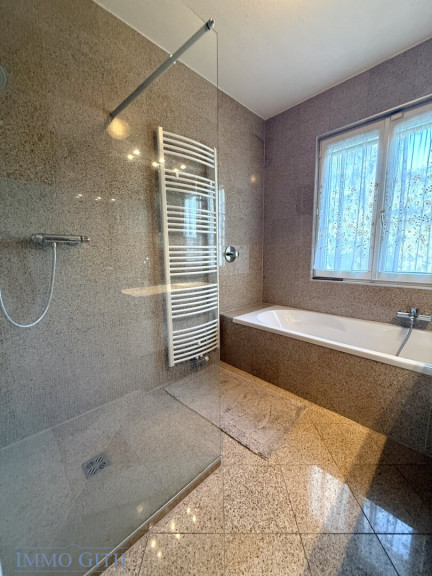 – ein modernes Badezimmer mit Walk-in-Dusche und Badewanne