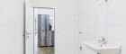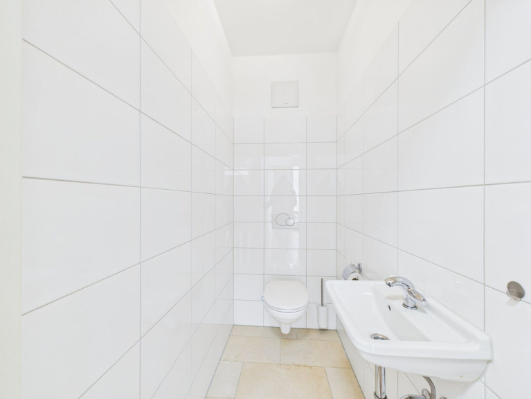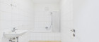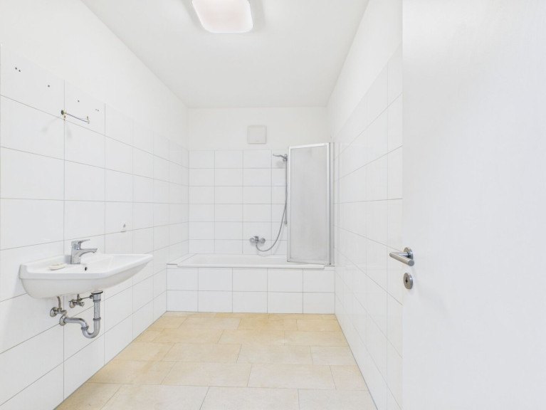Das Badezimmer ist mit sandsteinfarbenen Feinsteinfliesen am Boden und weißen Hochglanzfliesen an der Wand ausgestattet und verfügt über eine Badewanne. Ein separates Gäste-WC sowie ein praktischer Abstellraum sorgen für zusätzlichen Wohnkomfort.