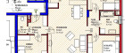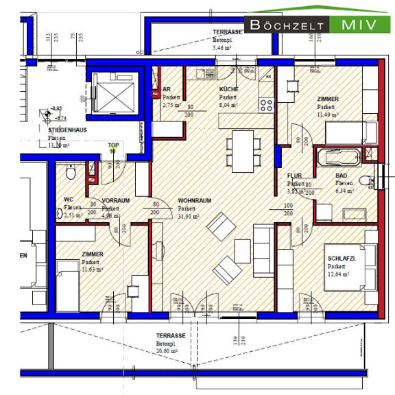 Die Wohnung teilt sich wie folgt auf: Vorraum, offene Küche mi Wohn-/Essbereich und Ausgang auf die Loggia, Schlafzimmer, zwei Kinderzimmer, Badezimmer mit Fenster, Badewanne und WC, separates WC und ein Abstellraum.