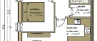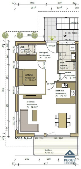 Raumeinteilung: Vorraum, Bad (mit Dusche und WM-Anschluss), WC separat, Abstellraum, Wohnzimmer mit Küchenzeile, Schlafzimmer; Balkon, Kellerabteil, 1 Carport-Stellplatz