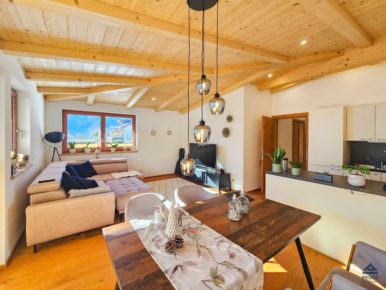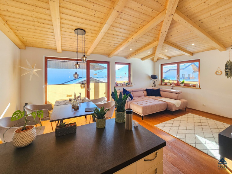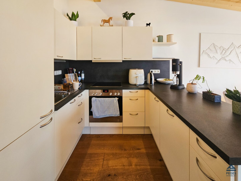 Über den freundlich gestalteten Eingangsbereich gelangt man in die mit Holz-Bodenbelägen ausgestatteten Wohnräume. Der Kochbereich ist harmonisch in den Wohnraum integriert und mit einer Einbauküche in weißem Design mit dunkler Arbeitsplatte (inkl. Geräten: Geschirrspüler, usw.)ausgestattet. Holzbalken an der Decke sorgen in der gesamten Wohnung für ein besonderes Flair und Gemütlichkeit. Der angenehm helle Wohnbereich mit Zugang zum überdachten Balkon mit traumhaftem Grün- und Bergblick bietet Platz für das gesellige Beisammensein. Für die ideale Ruheumgebung sorgt das heimelige Schlafzimmer mit Schranknische. (Der Schrank im Schlafzimmer kann eventuell von der Mieterin übernommen werden - optional.)