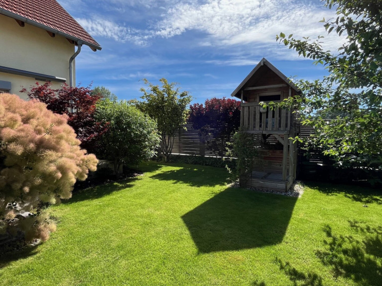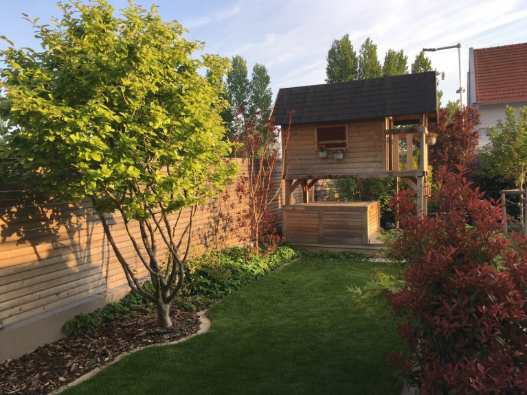 Der Garten wurde mit Rollrasen, automatischer Bewässerung und einem Mähroboter perfekt angelegt.
