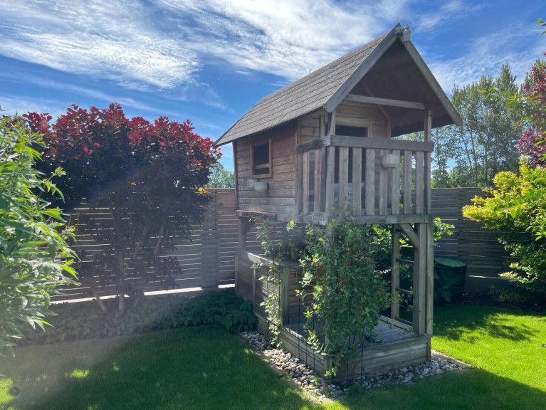 Auch an die jüngsten Bewohner wurde gedacht: Ein liebevoll gestaltetes Stelzenhaus sorgt für Spiel und Spaß.
