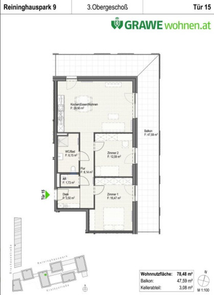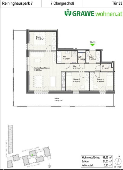 82 m² Wohnung im Reininghauspark 7 im 7. Stock mit Lift und großen BALKON bestehend aus,