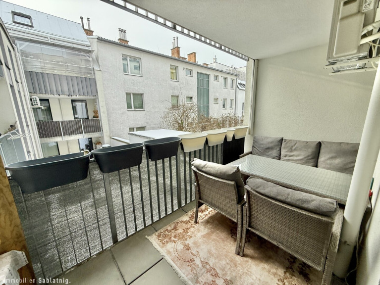 Die Loggia mit Stadtblick lädt zum Entspannen ein – ob bei einem Glas Wein am Abend oder beim Genießen der Sonne am Wochenende.