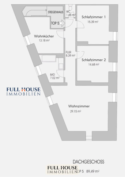 Die Wohnung befindet sich im Dachgeschoss des Hauses und verfügt über ca. 89,49 m² Wohnfläche. Der Grundriss bietet zwei Schlafzimmer, einen offenen Wohn-Ess-Kochbereich und ein Wohnzimmer sowie ein separates Bad und WC – ideal strukturiert auf einer Ebene.