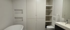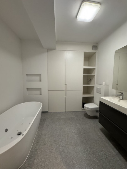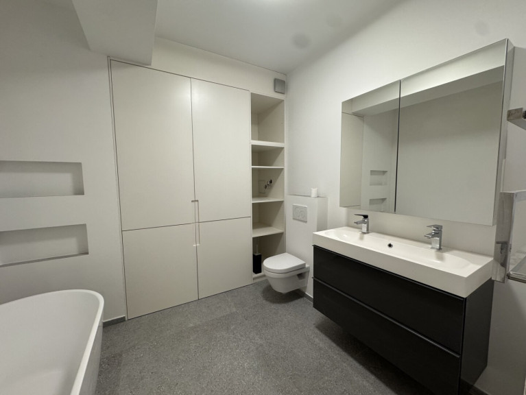 The bathroom is spacious and fitted with a modern bathtub. A washing machine connection is available. High quality materials and a timeless design create a very pleasant living atmosphere.