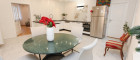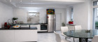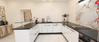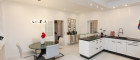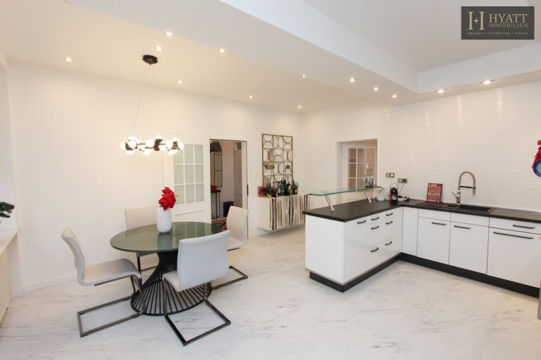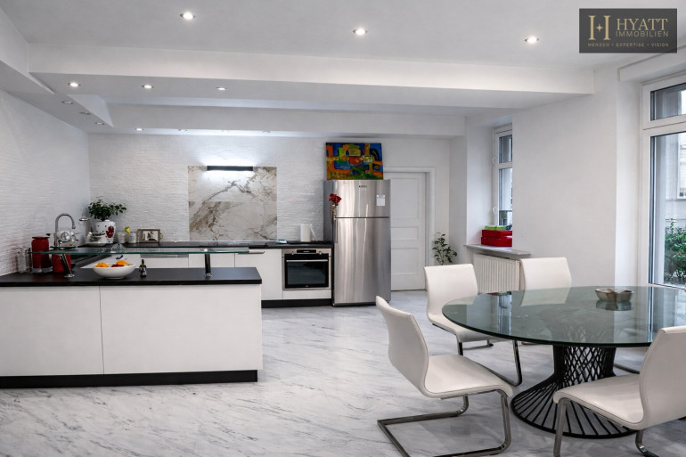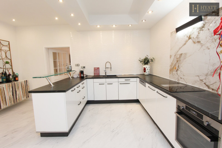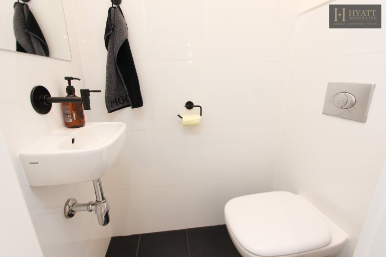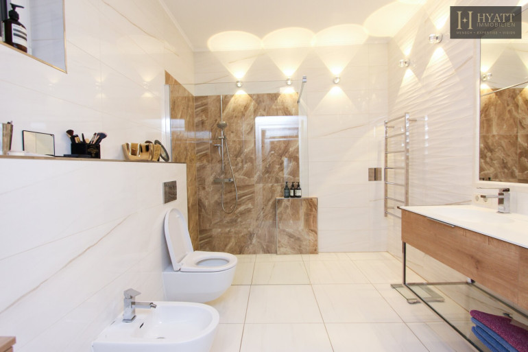 Die hochwertige Einbauküche ist mit Markengeräten ausgestattet und erfüllt höchste Ansprüche an Design und Funktionalität. Das elegante Badezimmer überzeugt mit Fußbodenheizung, Walk-in-Dusche und stilvollen Natursteinfliesen. Ergänzt wird das Raumangebot durch ein separates Gäste-WC.