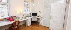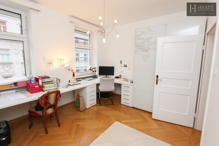Zwei weitere Zimmer stehen derzeit als Schlafzimmer und Arbeitszimmer zur Verfügung und bieten flexible Nutzungsmöglichkeiten. Ein separater Schrankraum mit maßgefertigten Einbaumöbeln fungiert als luxuriöse Ankleide und schafft außergewöhnlich viel Stauraum.