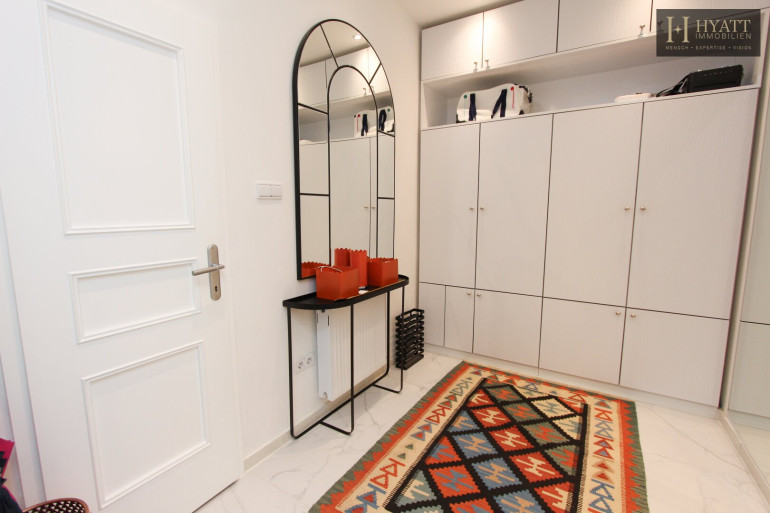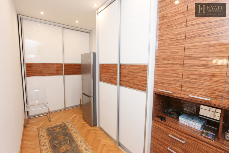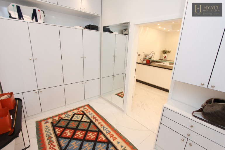 Edler Fischgrätparkett aus Vollholz, dezente Spotbeleuchtung, Klimaanlage, eine praktische Abstellkammer sowie ein Kellerabteil runden dieses außergewöhnliche Wohnangebot ab.
