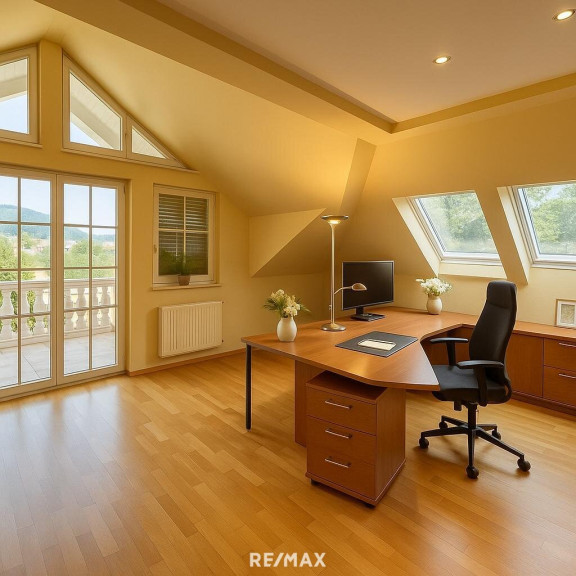 Die lichtdurchfluteten Räume bieten herrliche Ausblicke auf die umliegende Landschaft und den Weitblick auf die Berge. Auch die derzeit als Kanzlei genutzten Büroräumlichkeiten im oberen Bereich vereinen funktionale Arbeitsumgebung mit inspirierender Aussicht – ein Ort, der Wohnen und Arbeiten in perfekter Balance ermöglicht.