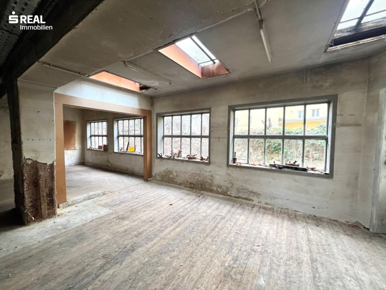 Hoftrakt: Hier befindet sich die ehemalige Werkstatt, darüber eine kleine Wohnung, die sich in Vorraum Wohnzimmer, Schlafzimmer, Küche, Bad mit Toilette, Terrasse unterteilt. Die Werkstatt ist sanierungsbedürftig.