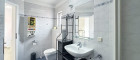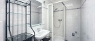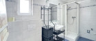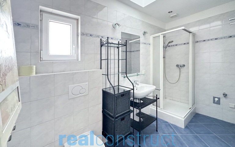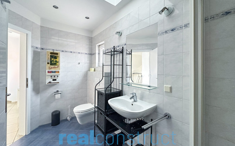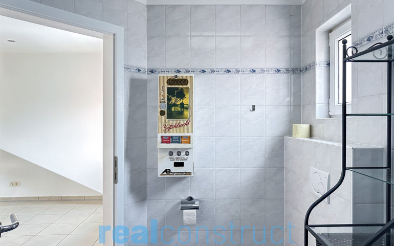 Badezimmer mit Waschtisch, Dusche, WC und Waschmaschinenanschluss