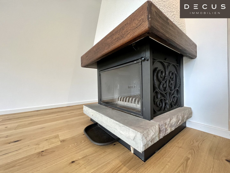 Fliesen, Parkett, Fußbodenheizung, Kamin, Wohnküche / offene Küche, Ostbalkon, Südbalkon, Bad mit Fenster, Badewanne, Dusche, Parkplatz