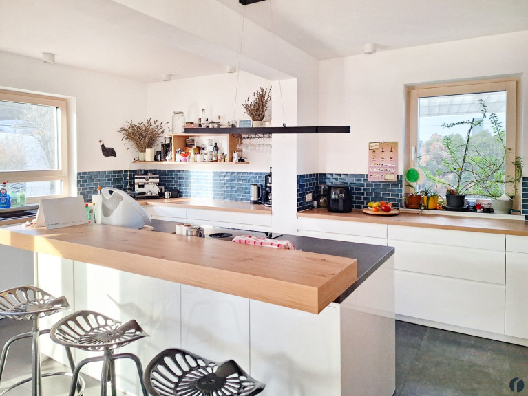 Im Erdgeschoss öffnet sich der großzügige Wohnbereich mit offener Küche, der viel Raum für gemeinsames Wohnen, Kochen und Entspannen bietet. Auf dieser Ebene befindet sich außerdem ein weiteres Zimmer, ein gut ausgestattetes Badezimmer, sowie ein separates Gäste-WC.