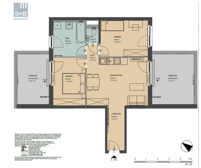 Die Wohnung verfügt über ca. 63 m² Nutzfläche und zwei großen Terrassen. Die Wohnräume sind mit Parkettboden, die Nassräume mit Fliesen ausgestattet. 3-fach-verglaste Fenster mit elektrischer Außenbeschattung sorgen für angenehmes Raumklima.