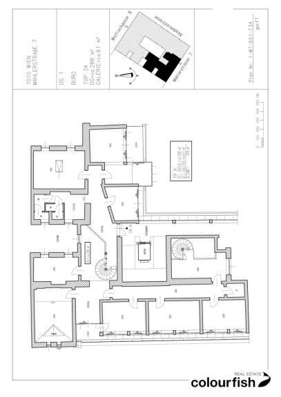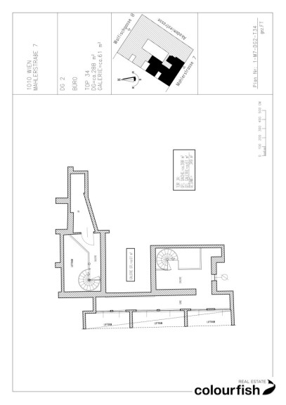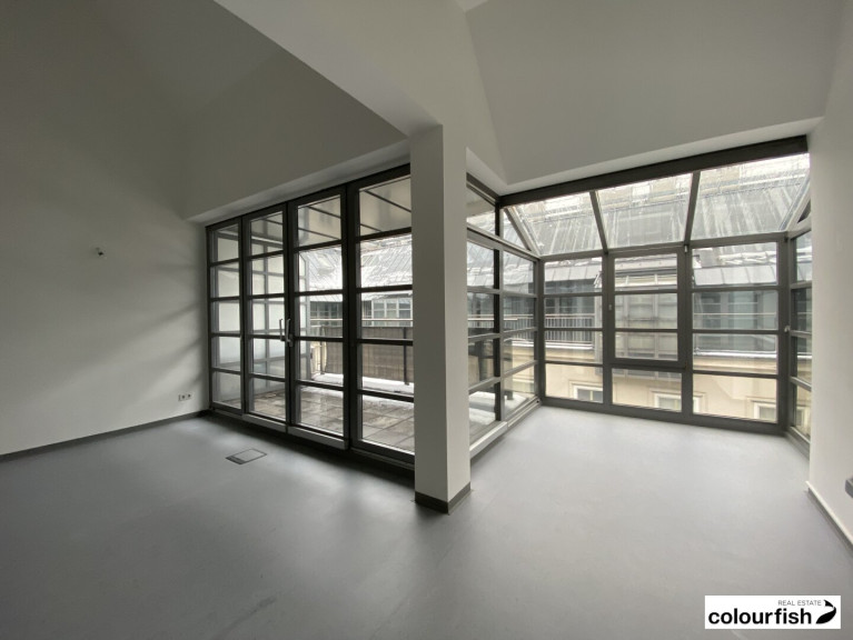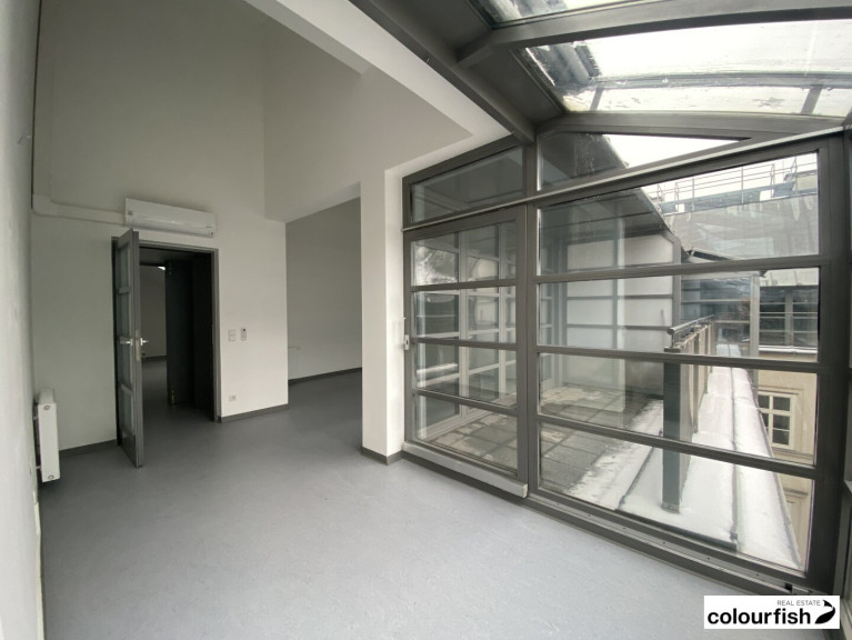 Zur Vermietung gelangt eine ca. 349 m² große Bürofläche in sehr guter Lage des 1. Bezirks. Die Fläche befindet sich im Dachgeschoss eines repräsentativen Altbaus und teilt sich auf in einen Vorraum, acht getrennte Bürozimmer, zwei Galeriebereiche die jeweils über eine Wendeltreppe erreichbar sind sowie eine ausgestatteten Teeküche und getrennte Sanitärräume.